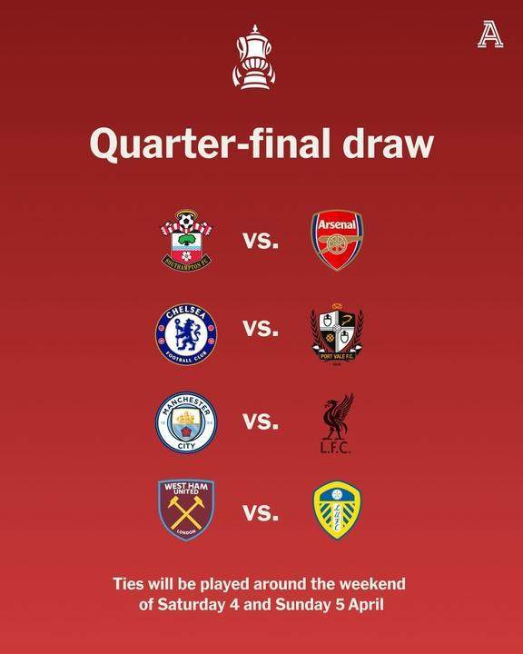 3月10日,英格兰足总杯1/4决赛的抽签结果已经出炉,曼城与利物浦狭路相逢。本次抽签嘉宾为乔·科尔和乔·哈特。全部抽签结果: