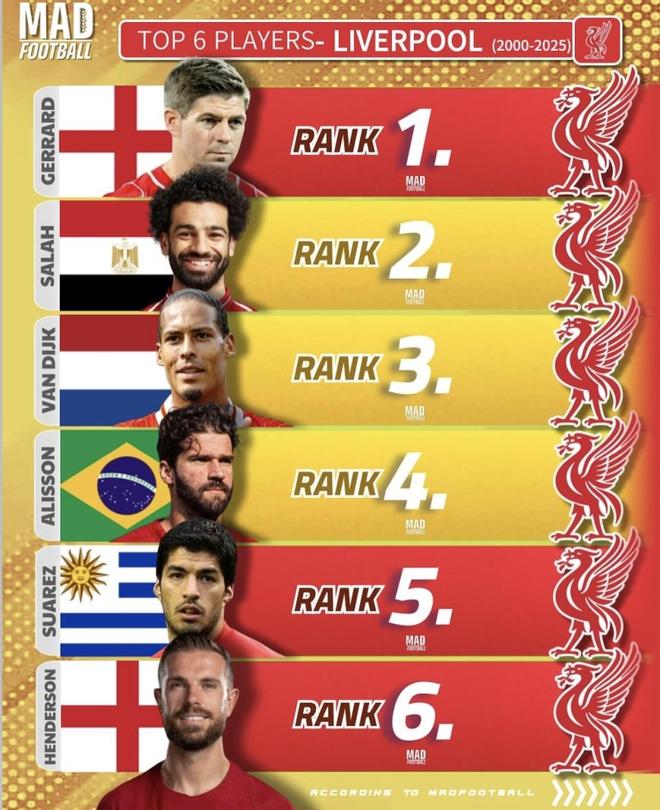 最近MAD FOOTBALL发布了“2000–2025利物浦最佳6人”。杰拉德、萨拉赫、范戴克等球员入选。马内、菲尔米诺遗憾落榜。争议主要集中在头名与第六位。